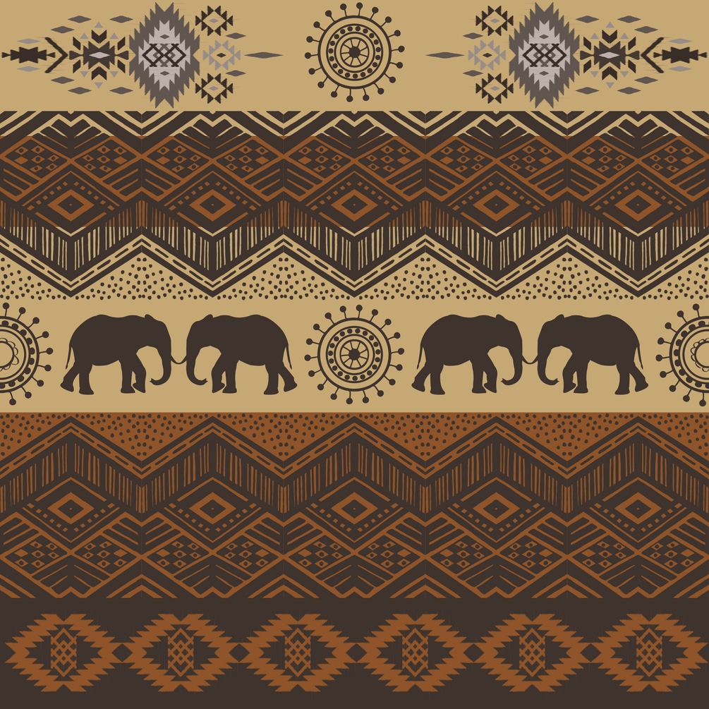 A traditional African-inspired pattern with geometric designs, elephants, and symbolic circular motifs. It uses earthy tones like brown, orange, and black, evoking a cultural and ethnic aesthetic. The design is rich in tribal elements, perfect for use in textiles, home decor, or artwork reflecting African heritage.